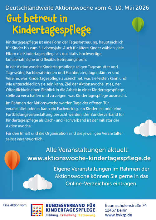 Der Bundesverband für Kindertagespflege hat Materialien für die Aktionswoche vorbereitet, die Sie hier bestellen können. Einige Materialien sind ohne Datum und daher zeitunabhängig immer nutzbar.