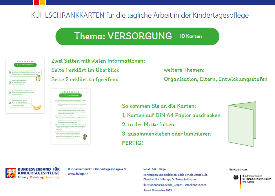 Die 35 verschiedenen Karten enthalten Tipps zur Versorgung, Vorratshaltung, Organisation, zu Essensplänen, Rezepten, Elternkontakt, aber auch zu den Entwicklungsstufen von Kindern. Sie können ausgedruckt, gefaltet und dann sichtbar und schnell einsehbar am Kühlschrank oder einem anderen Ort in der Kindertagespflegestelle angebracht werden.