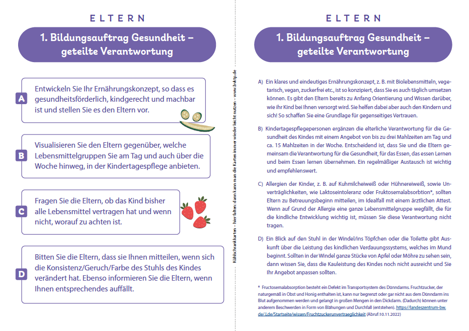 Die 35 verschiedenen Karten enthalten Tipps zur Versorgung, Vorratshaltung, Organisation, zu Essensplänen, Rezepten, Elternkontakt, aber auch zu den Entwicklungsstufen von Kindern. Sie können ausgedruckt, gefaltet und dann sichtbar und schnell einsehbar am Kühlschrank oder einem anderen Ort in der Kindertagespflegestelle angebracht werden.